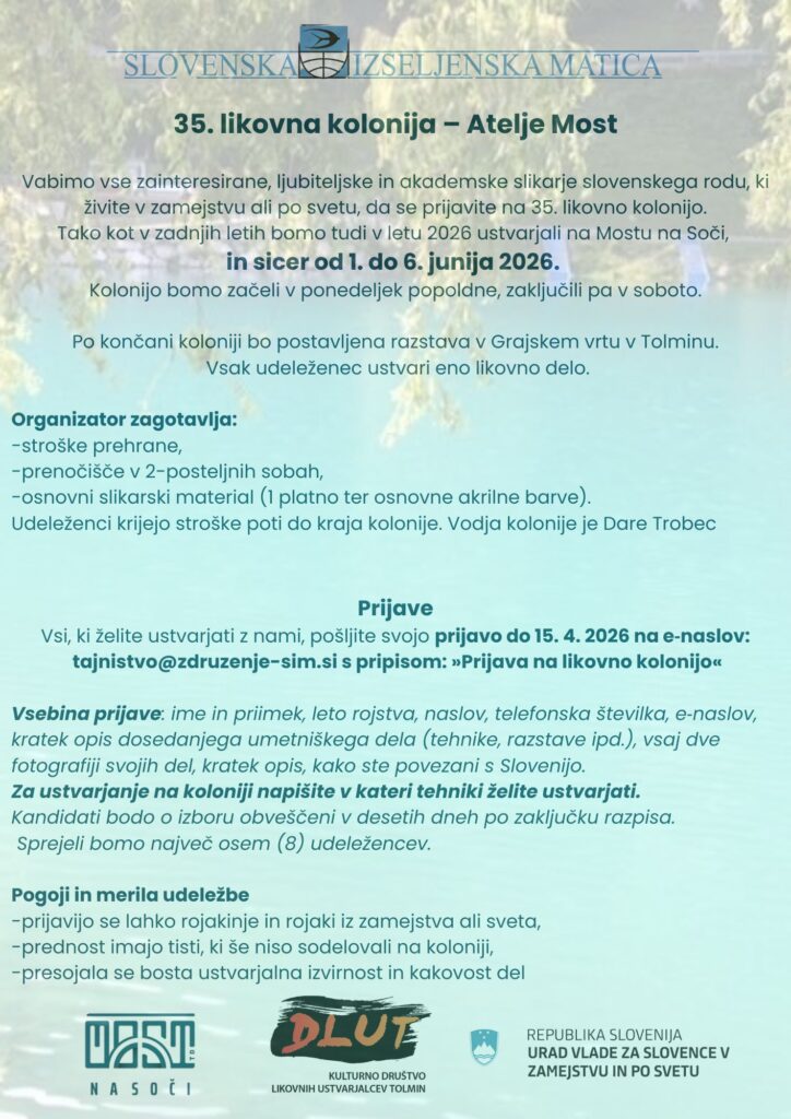 Na Mostu na Soči poteka med 2. in 7. junijem likovne kolonija, na kateri se že leta, letos je to 34. kolonija, srečujejo in ustvarjajo umetnice in umetniki, naši rojaki, ki živijo izven meja Slovenije. Letos se jih je zbralo 8 iz tujine, pridružili so se tudi 3...
