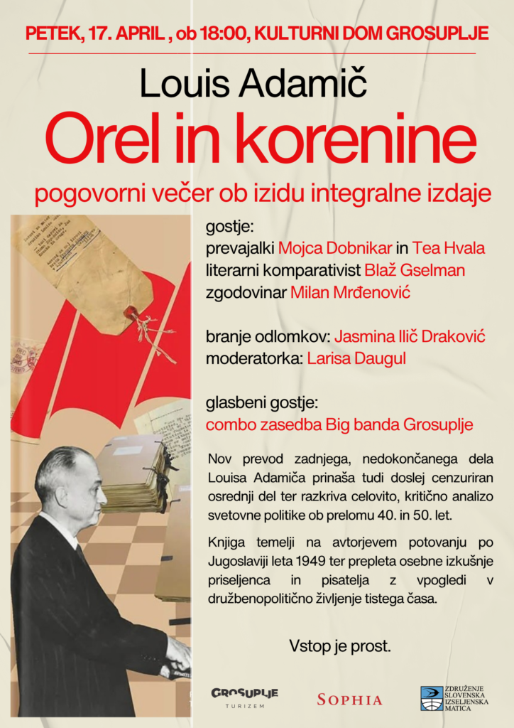 V petek, 17. aprila, bo v Kulturnem domu Grosuplje potekala predstavitev knjige Louisa Adamiča z naslovom Orel in korenine. Gre za izjemno pomembno delo, ki v obsežnem prevodu prinaša več kot 700 strani bogatega besedila ter vključuje tudi doslej še neobjavljeno...